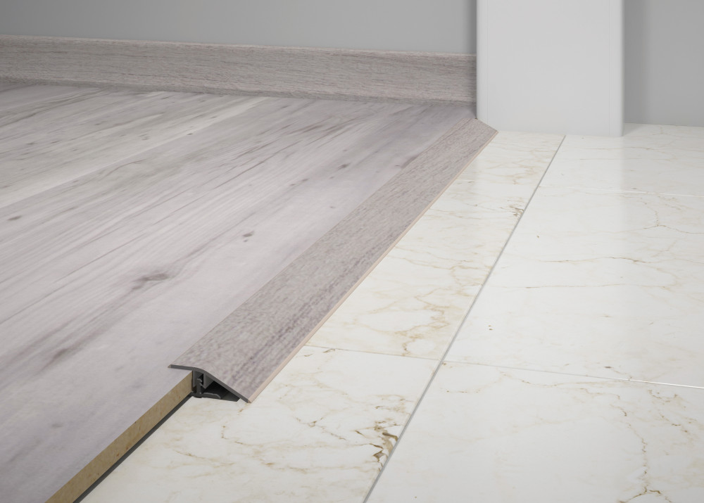 Acabamento que permite a passagem de nível entre o Durafloor e outros tipos de pisos de diferentes espessuras. A medida máxima de desnível para utilização do Perfil Redutor é de 9 mm.