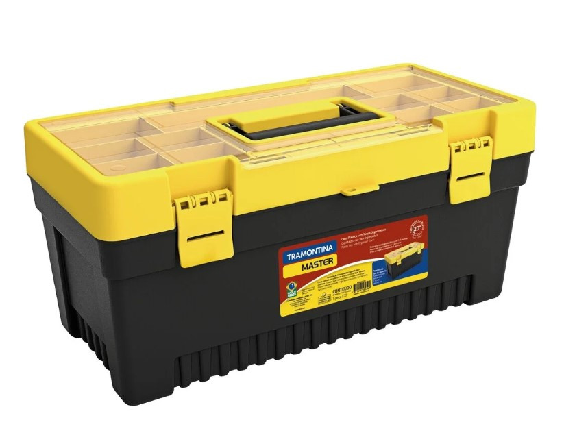 Caixa plástica para ferramentas 20". Corpo injetado em plástico de alta resistência. Possui tampa organizadora com 11 divisórias. Duas travas plásticas. Bandeja plástica interna removível. Possibilita o uso de cadeado. Capacidade de carga interna: 12 Kg.