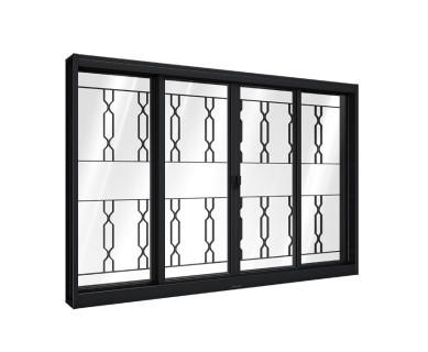 Janela riobras de correr central preta 2 folhas móveis e 2 fixas com grade mosaico 100 x 120