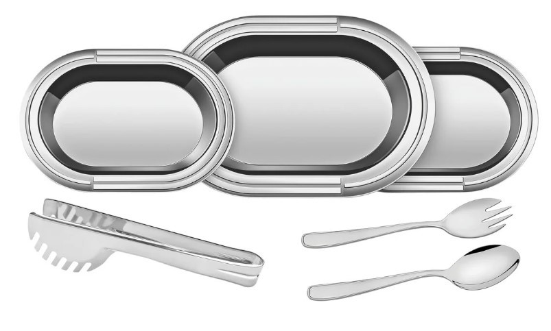 Peças totalmente feitas de aço inox, por isso não soltam nenhum resíduo nos alimentos, mantendo-os saudáveis. Altamente duráveis mantêm suas características originais, preservando a beleza, a higiene e a durabilidade do material. Beleza e praticidade em seu design. Ideal para servir à mesa. Acabamento em brilho, com detalhes em alto relevo nas bordas. Higiênicas e de fácil limpeza. Podem ser lavadas diariamente na máquina de lavar louças.